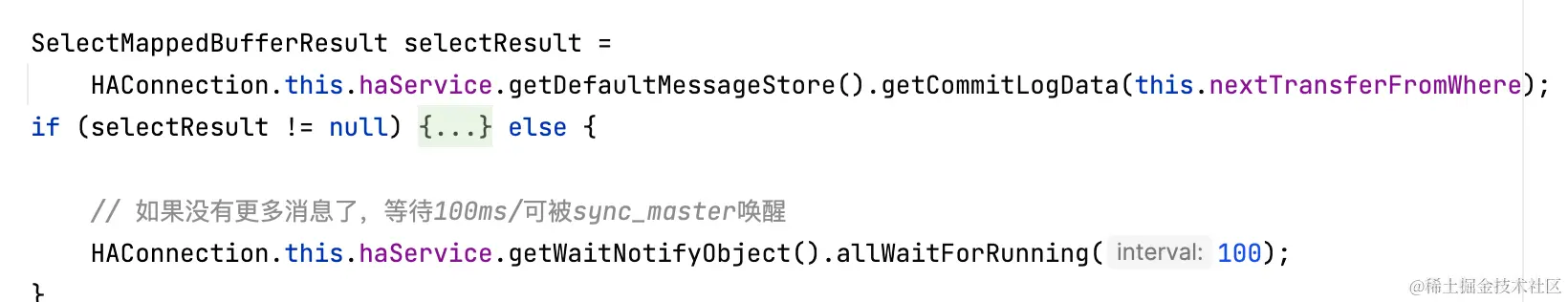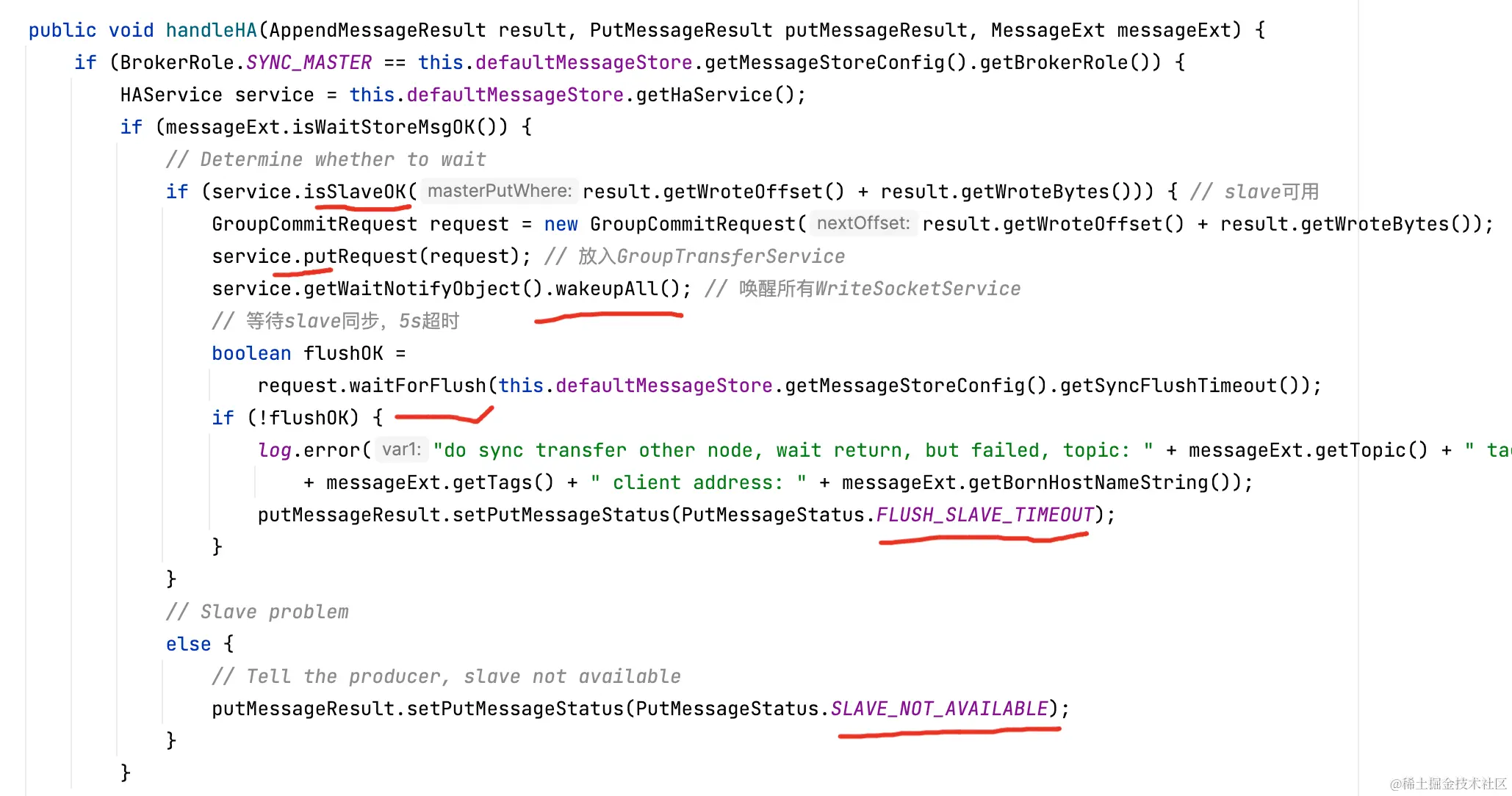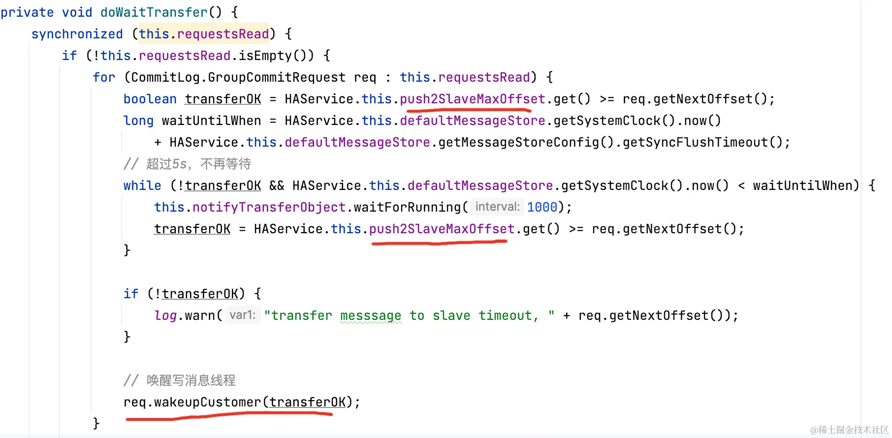 PutMessage线程需要阻塞等待slave复制完成,才能被GroupTransferService唤醒。