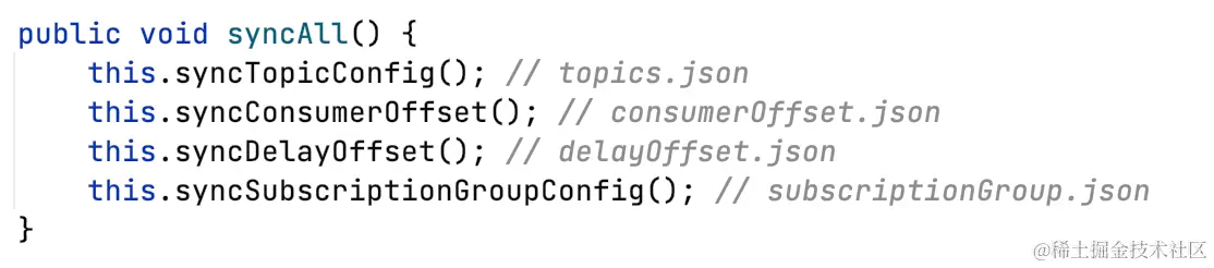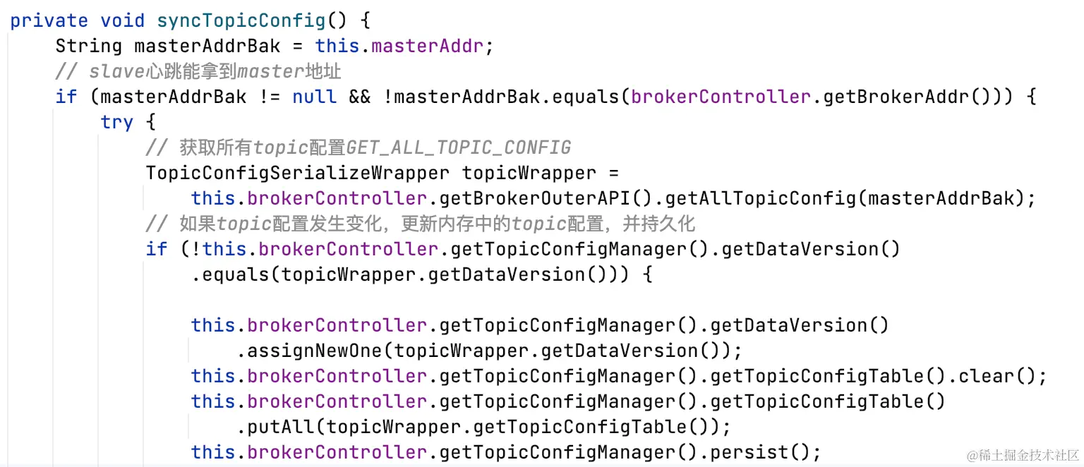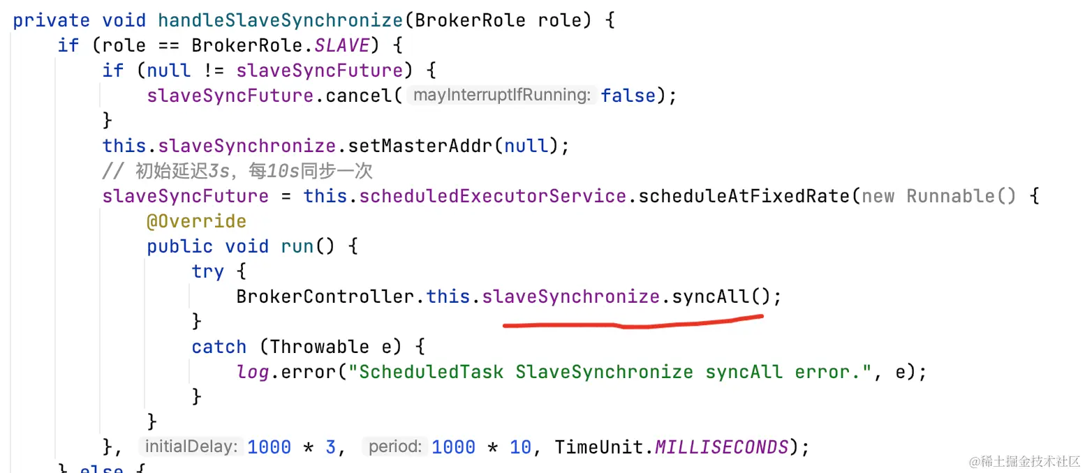 SlaveSynchronize每隔10s,请求mater的普通通讯地址(10911)获取相关配置,进行全量同步。