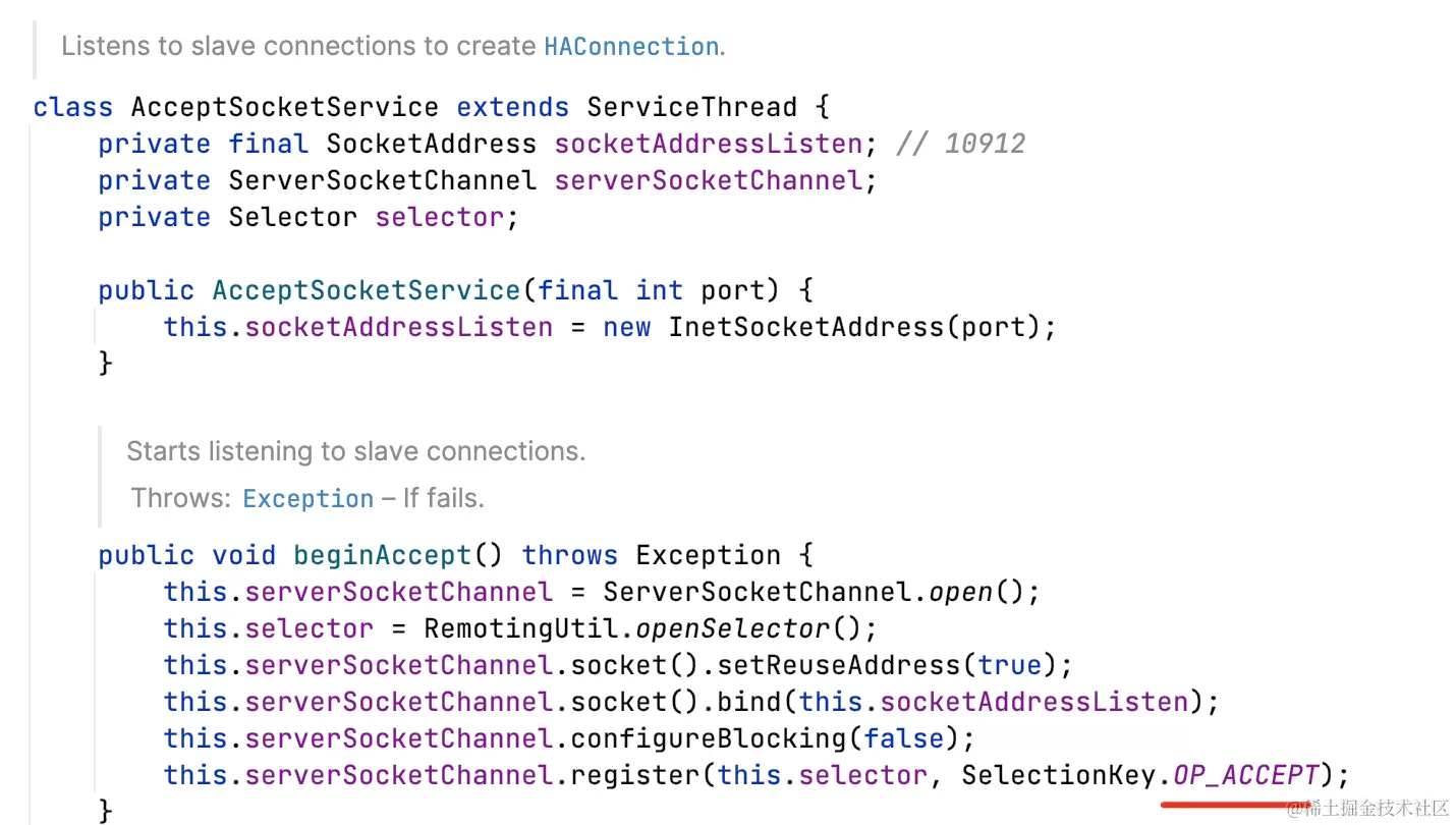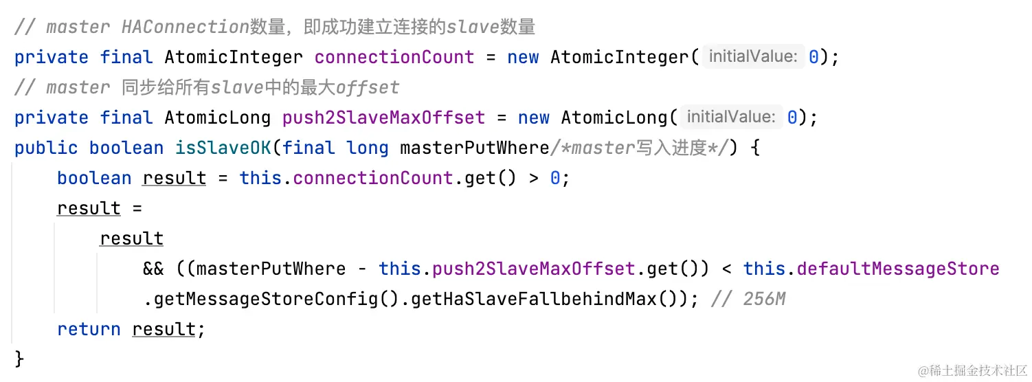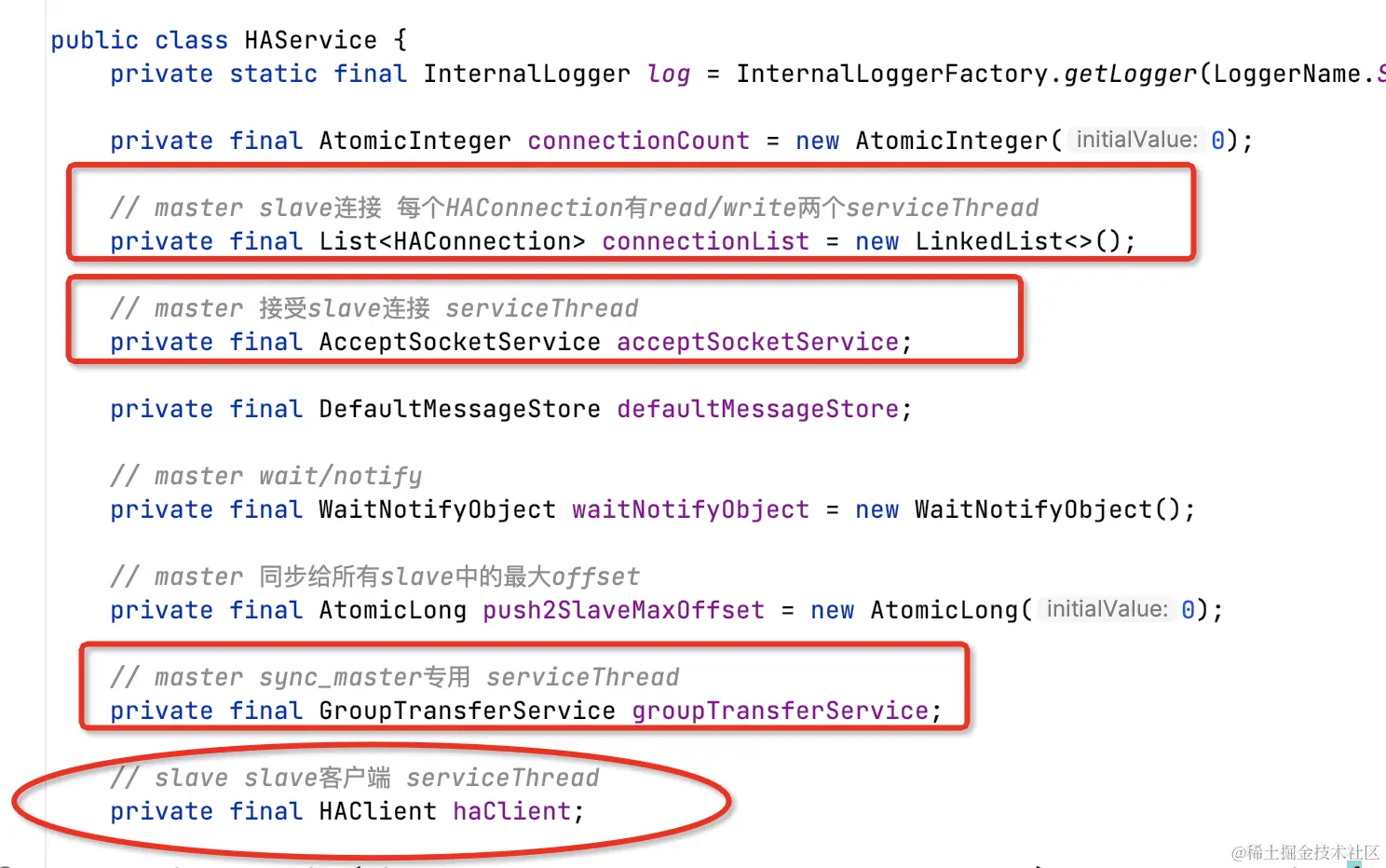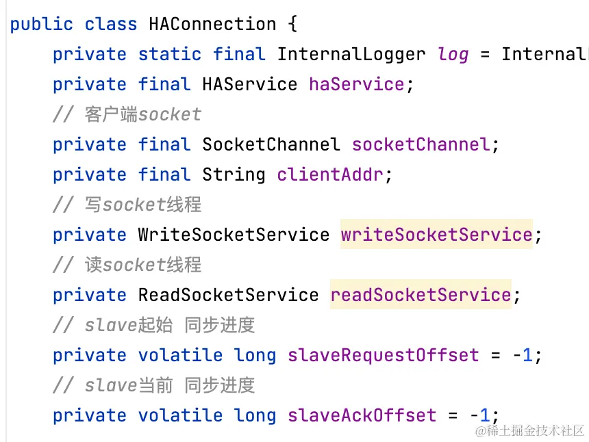 - master:收到slave的socket,创建一个HAConnection,开启一个读socket线程ReadSocketService和一个写socket线程WriteSocketService;