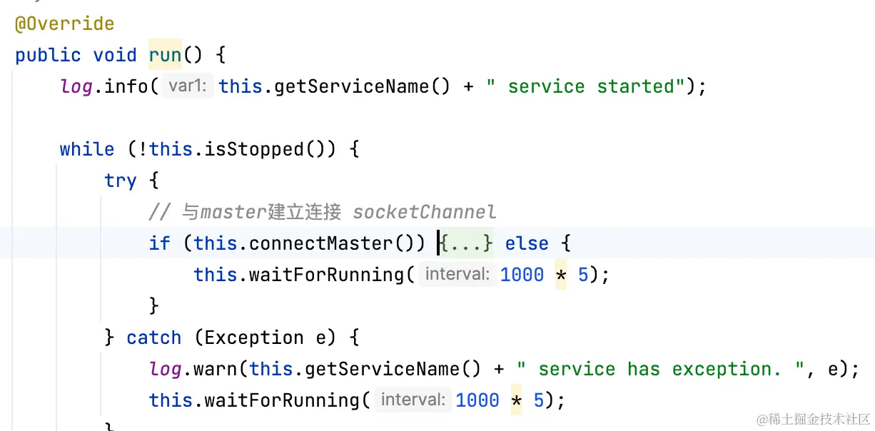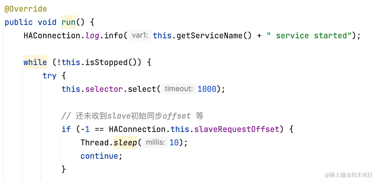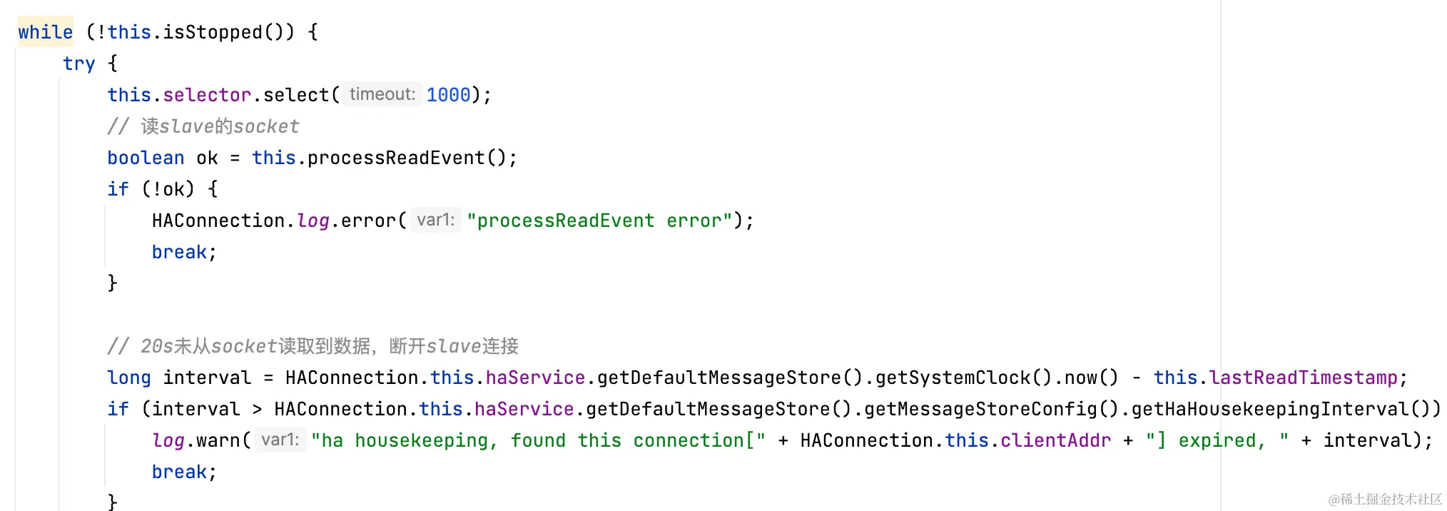 - master:收到slave的socket,创建一个HAConnection,开启一个读socket线程ReadSocketService和一个写socket线程WriteSocketService;