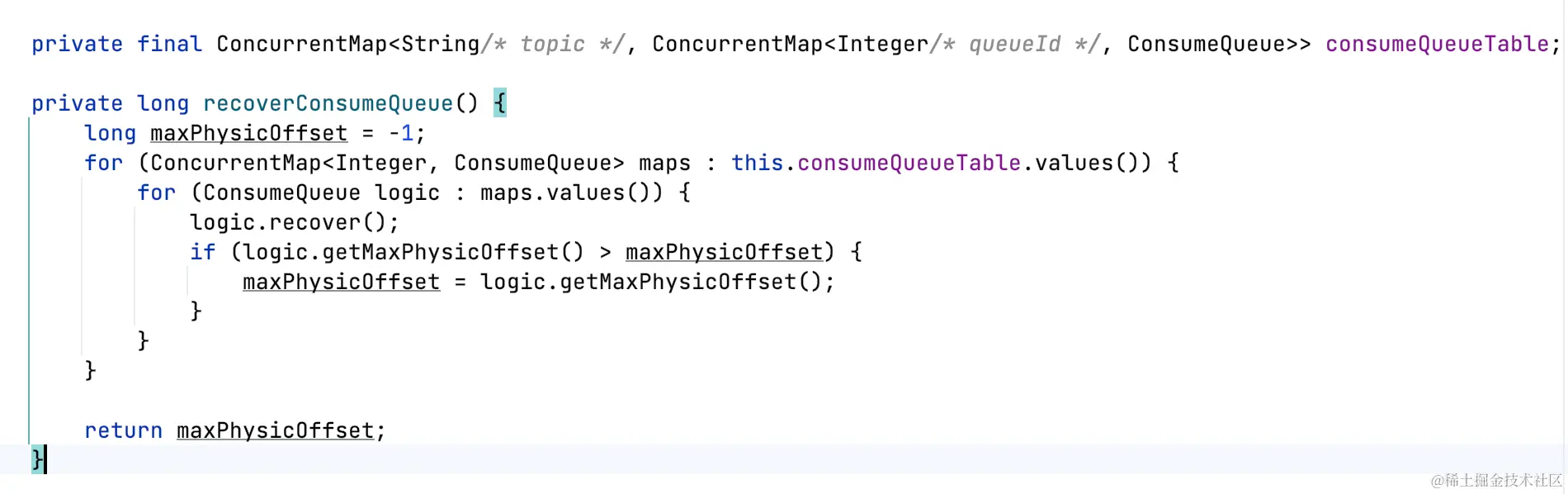 遍历每个队列ConsumeQueue执行恢复,返回所有consumequeue中,commitlog的最大物理offset。