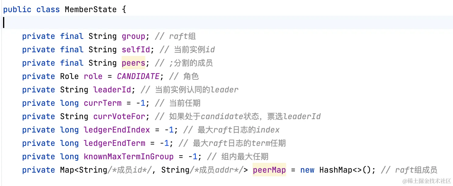 MemberState包括当前节点raft角色、最大raft日志、当前leader、集群成员列表等等。