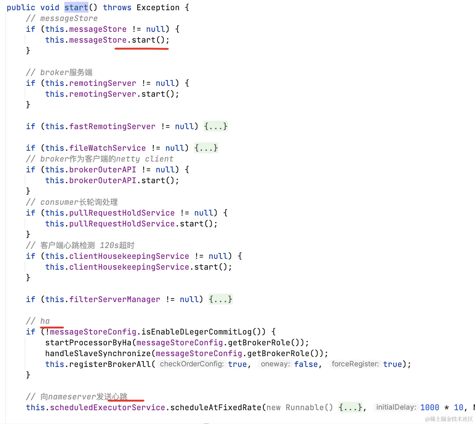 这里仅关注一下DefaultMessageStore启动和ha部分在启动流程中的位置。