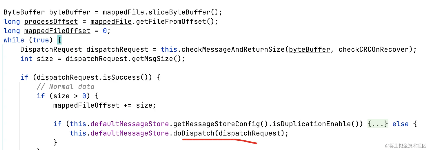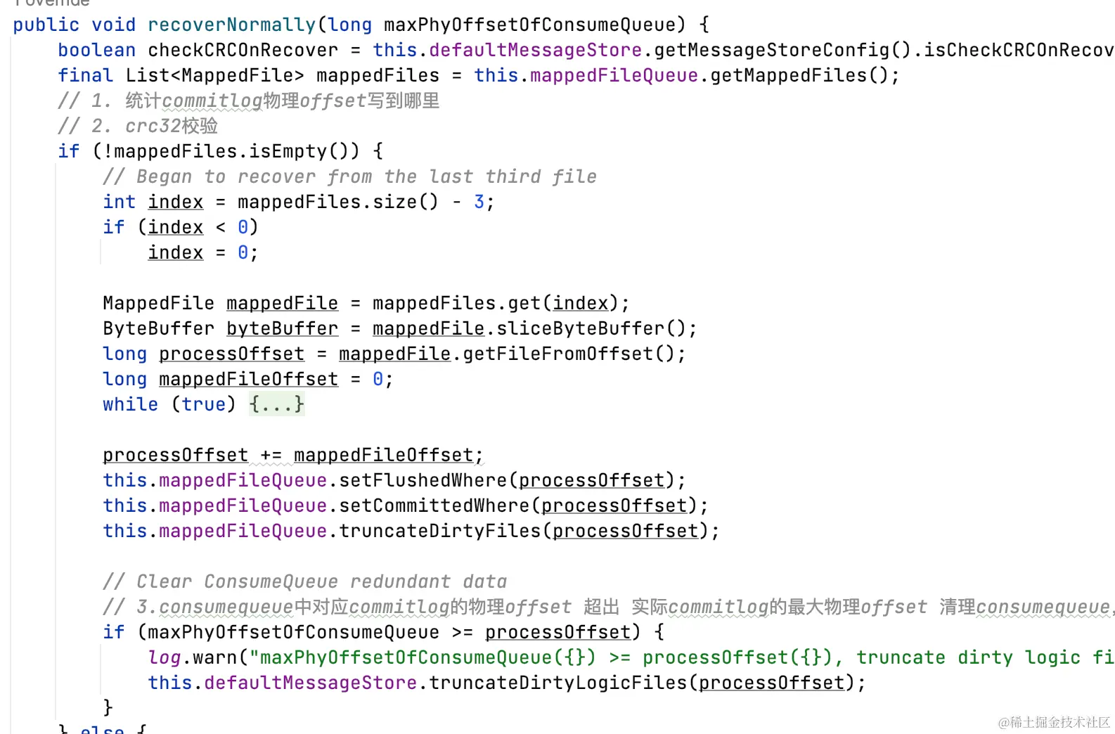 - 入参是consumequeue中最大的commitlog物理offset,如果consumequeue刷盘进度大于实际commitlog,截断consumequeue中的记录(忽略);