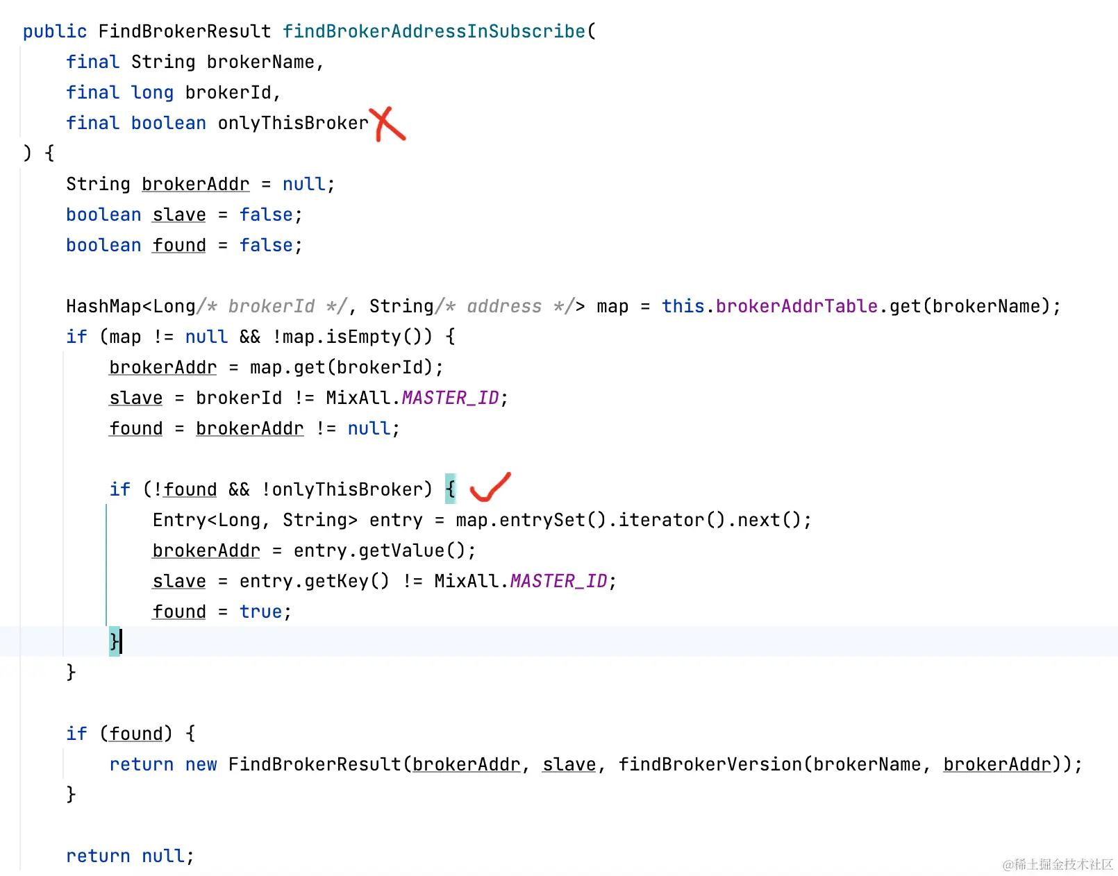 只会找queue对应的master broker,如果找不到master broker,consumer侧会维持现状(不改变ProcessQueue分配和状态) 。