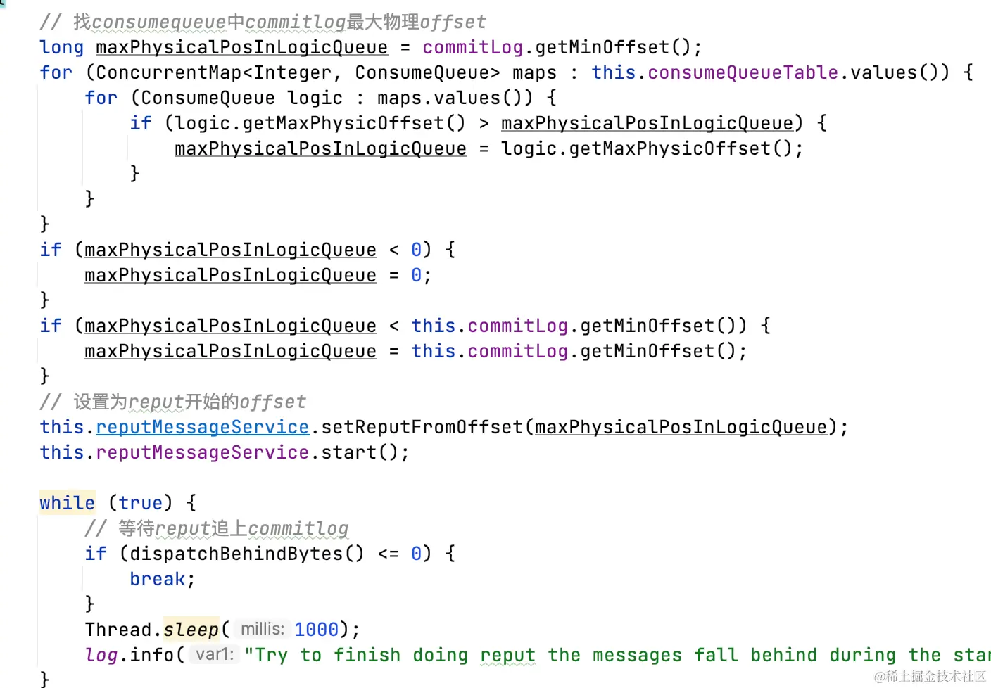 等待reput进度追上commitlog最大物理offset,main线程才继续执行。