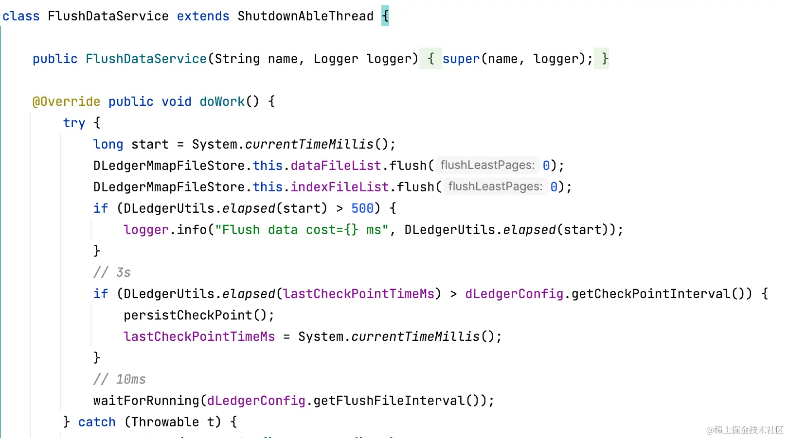 对于data和index每隔10ms刷盘一次,提交index(checkpoint)每隔3s刷盘一次。