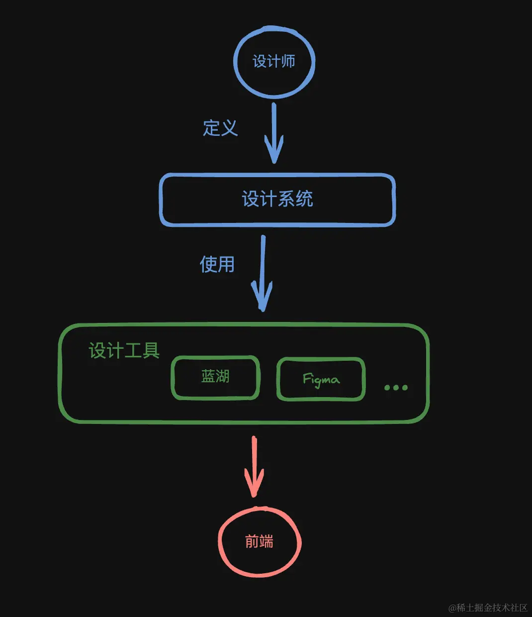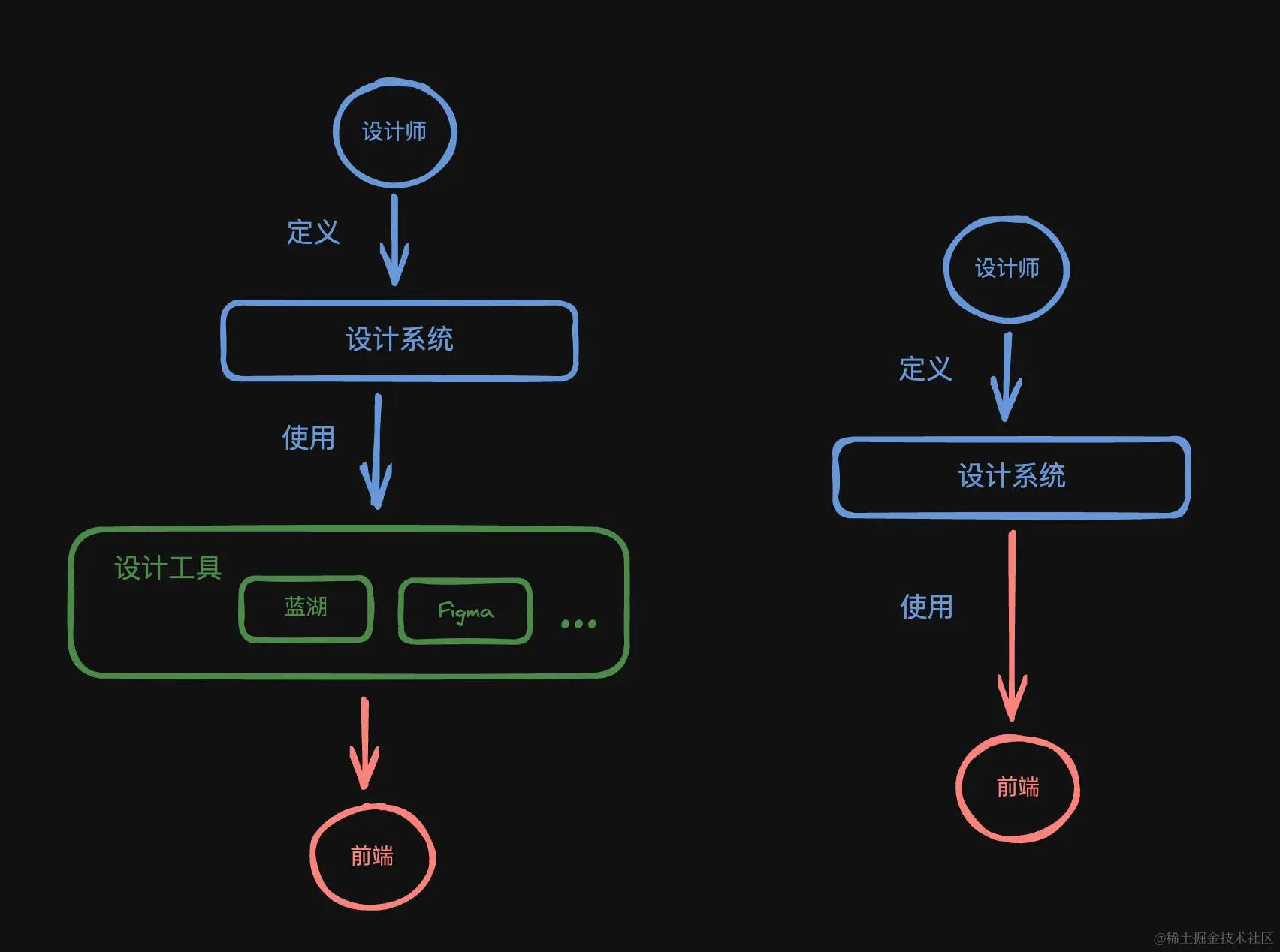 这种情况下,设计系统本身就是设计师与前端工程师之间的共同语言,就不需要再经过设计工具(比如蓝湖、Figma)翻译成语义化CSS给前端: