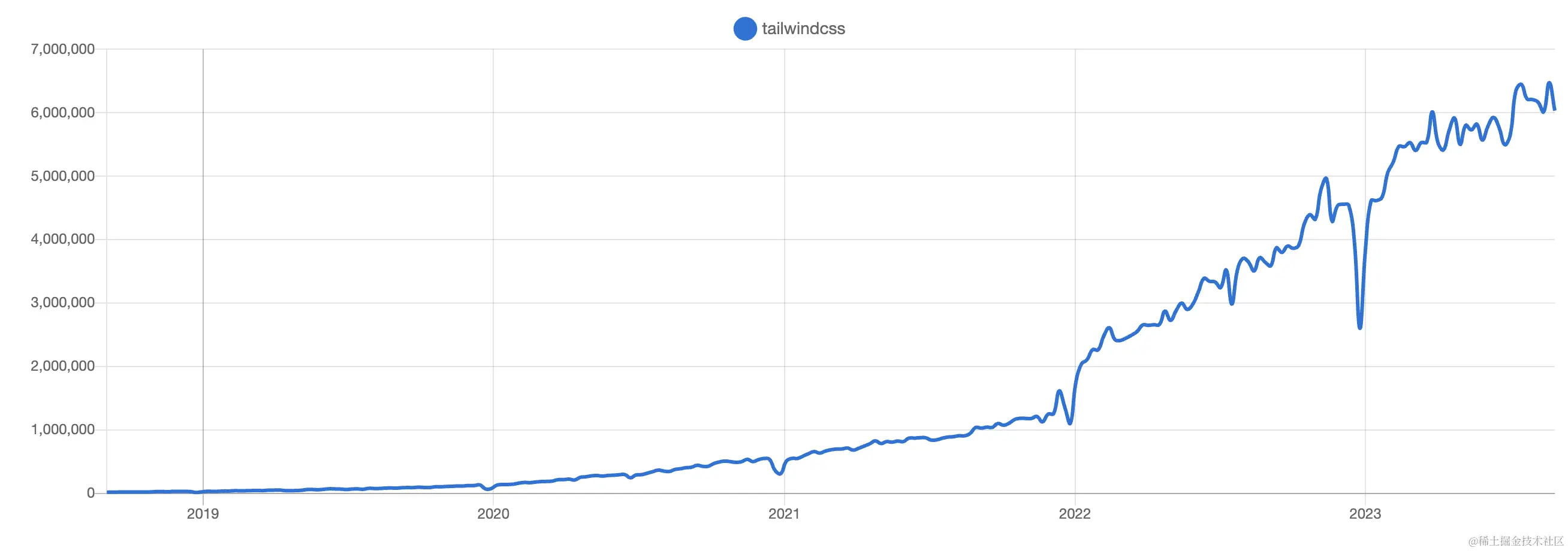 从17年诞生至今,社区对TailwindCSS的接受程度不断提升: