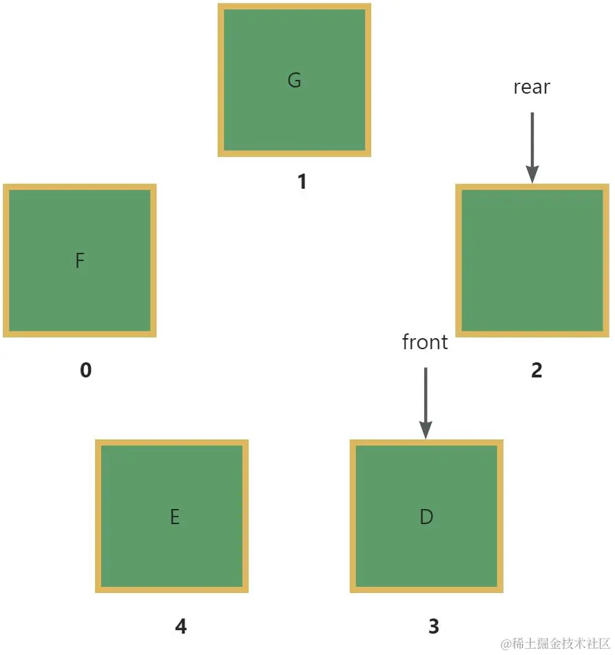 front即 队头指针 指向队头元素,rear即队尾指针 指向 队尾元素的下一个元素。
