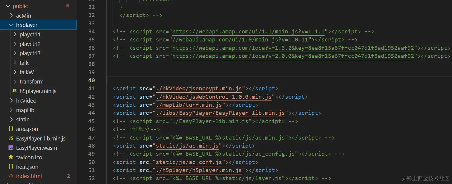 在public 里面放入官网的h5 player.min.js, 并且在html 引入这个js文件