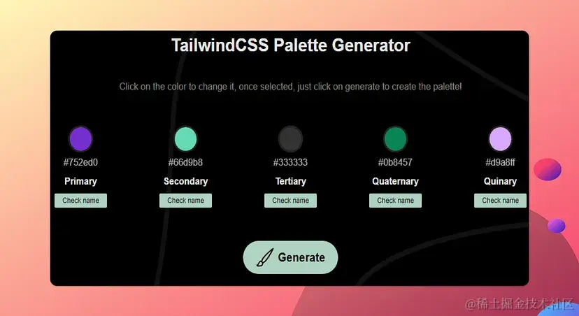 只需选择颜色,然后点击 "生成 "即可。它将创建一个 TailwindCSS 调色板,你只需点击一下即可复制。十六进制、RGB和HSL是你可以选择的三个选项。你可以从色轮中选择,也可以输入你自己的颜色。