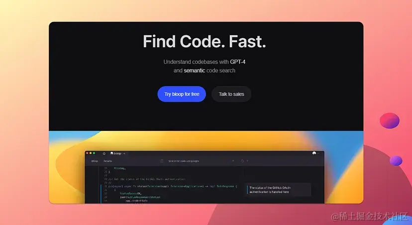 Bloop 是一个基于 Rust 的快速代码搜索引擎。它允许快速搜索代码,并使代码更易于理解。他们有三种计划:个人(免费)、初创企业(45 美元)和企业(美元)。
