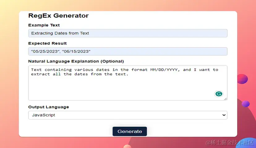 RegexGPT 是编写 RegEx 模式的绝佳工具。它真的令人难以置信。试一试,你就知道了。它的工作原理是:给它一个示例文本,输入预期结果,你也可以稍微解释一下,这取决于你,然后选择要生成 RegEx 的语言,点击生成按钮。