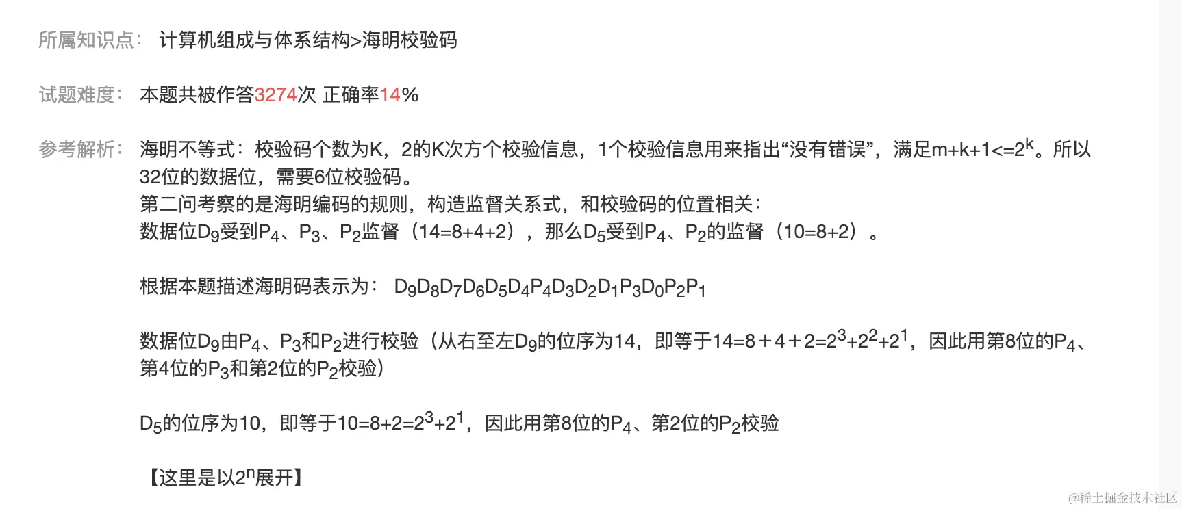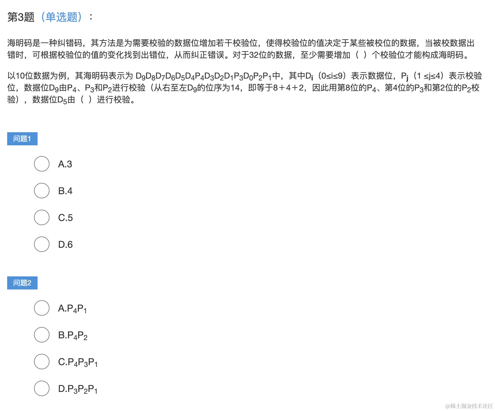 以10位数据为例,其海明码表示为 D(0≤i≤9)表示数据位,P