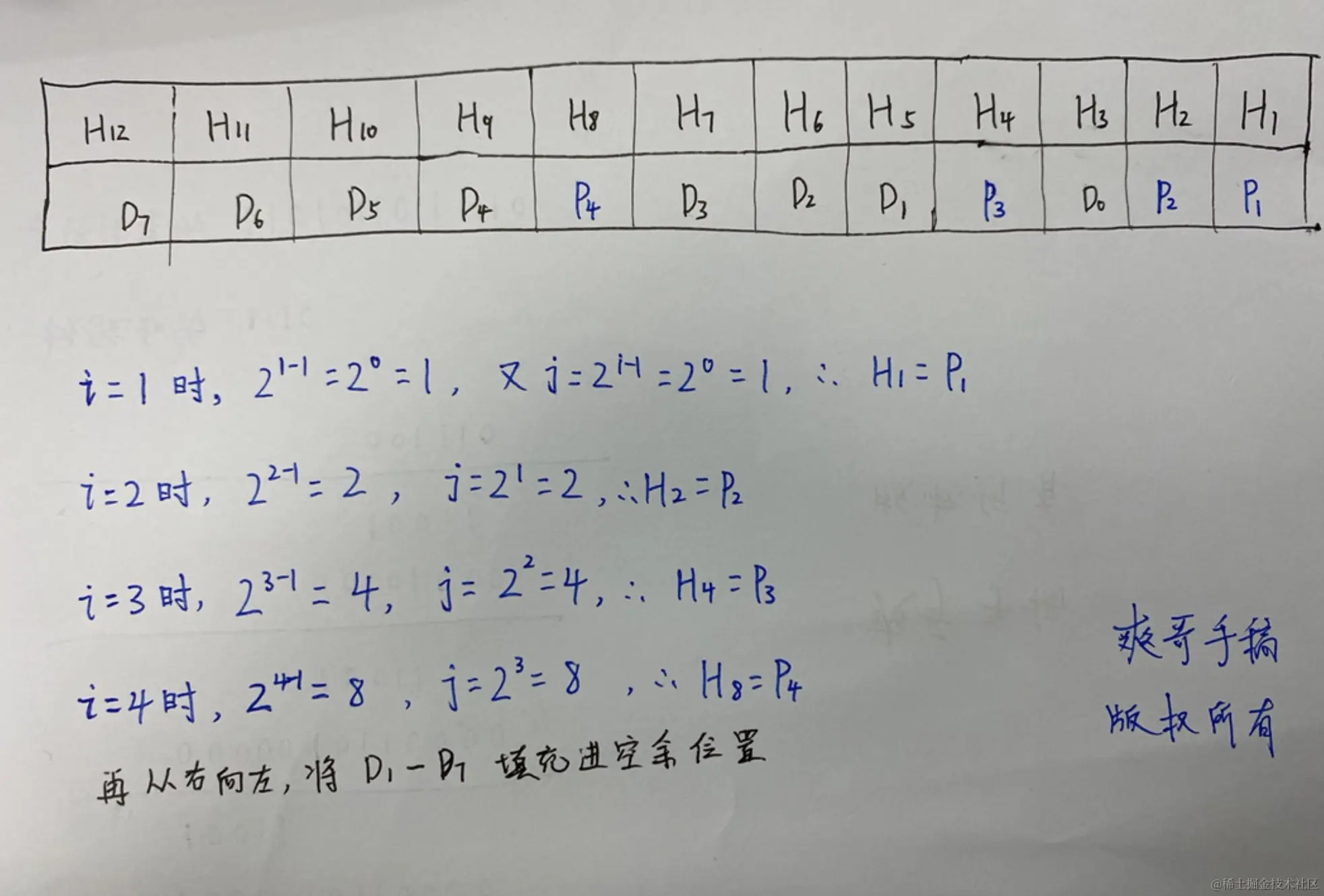 校验位P 在海明码的第 2i−1 位,即 Hj=Pi,j=2i−1,i从1开始计数。