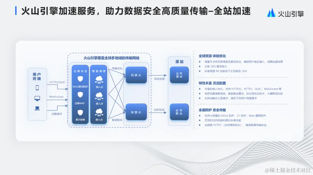 全站加速路径如图所示,左侧是各种协议,上文提到我们支持一些安全能力,通过智能调度就近接入,再通过传输优化智能路由选路,到达回源点,最后到业务源站。其特点是: