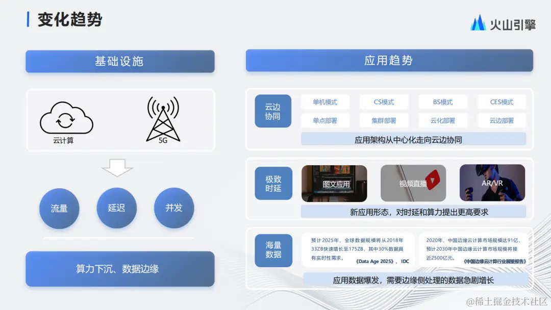 从应用趋势来看,应用形态从早期的单机模式到现在的更加多元化。基于低时延、低成本等考虑,应用部署模式逐步从云中心模式走向云边协同。同时,应用形态从早期的图文应用到视频直播再到AR/VR,新的应用形态对时延和算力提出了更高的要求。此外,应用数据持续爆发,需要边缘侧处理的数据随之急剧增长。