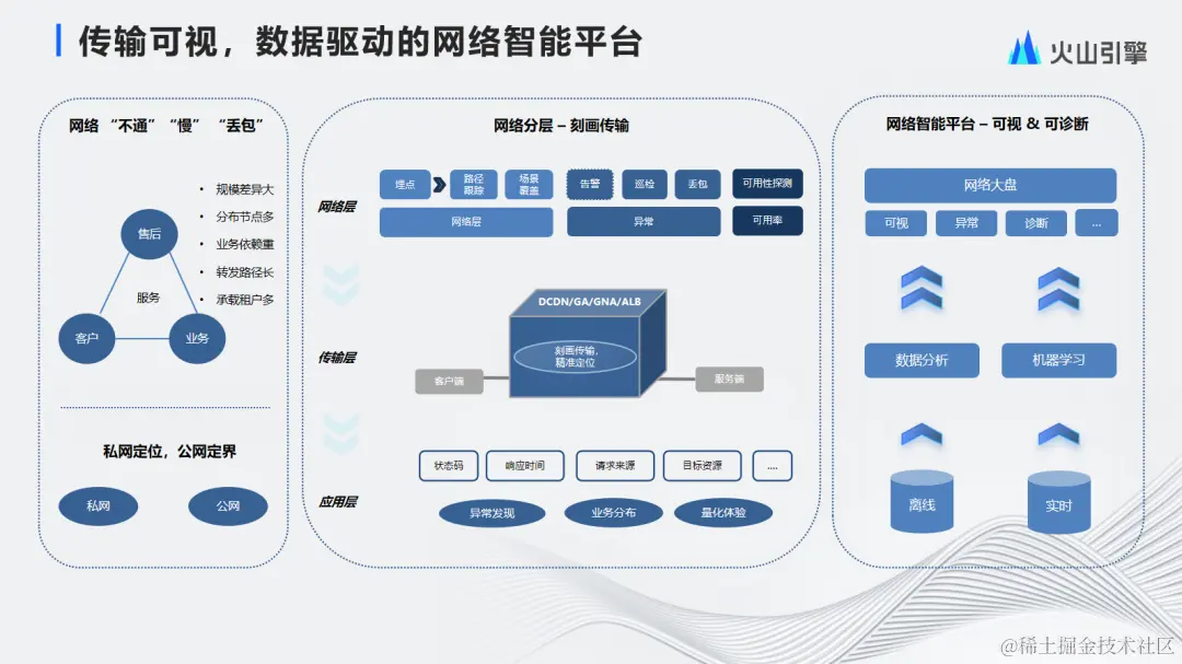 在结合网络层、传输层、应用层后,能够高效直接地定位许多网络上的问题。基于这样的思考,我们会推出一个网络智能的平台,前面提到的是站在运维运营角度,而这里是指在网络传输,包括网络的一些疑难杂症维度开展更多工作;针对离线和实时数据的一些分析,以及机器学习相关的处理后,我们在网络大盘上,在更多场景下,把可视化异常诊断的能力做到更好。
