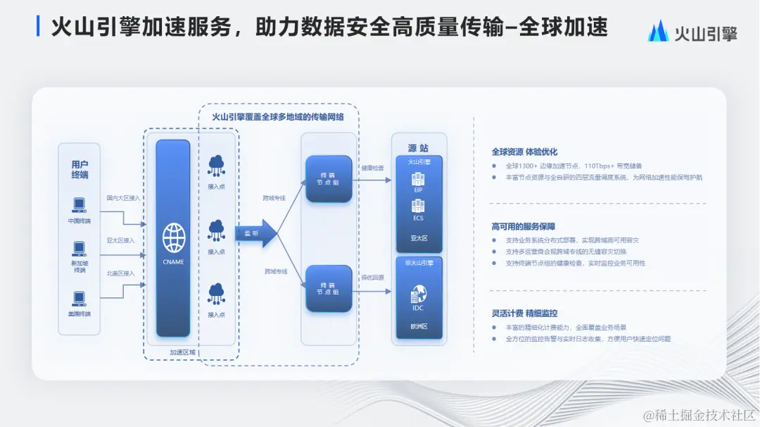 全球加速路径如图所示,支持不同大区的接入,包括国内、亚太、北美等区域,通过网络调度就近上车,经跨域专线到达终端节点组,再通过健康检查包括择优回源到达源站。源站同时支持在火山引擎或非火山引擎的DC部署。产品上主要有三个特点:
