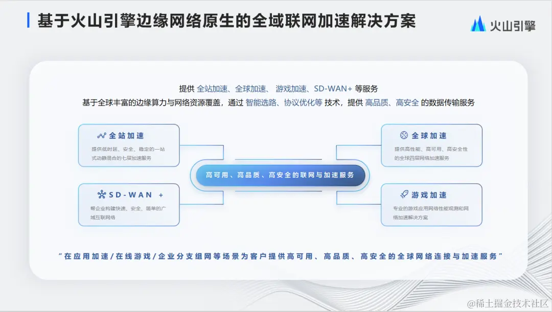 我们在联网加速产品体系中对外提供了全站加速、全球加速、游戏加速以及SD-WAN+等服务。基于全球丰富的边缘算力和网络资源的覆盖,通过智能选路、协议优化等技术,提供高品质、高安全的数据传输服务。其中,全站加速的目标是提供低时延、安全、稳定的一站式动静混合的七层加速服务。全球加速面向的是全球四层的网络加速场景,提供高性能、高可用、高安全性的全球四层网络加速服务。