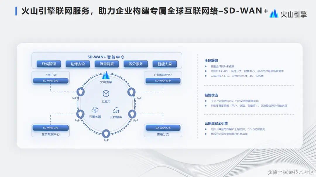 SD-WAN主要解决企业的分支组网、办公加速、混合云等场景;基于覆盖了全球的PoP资源,根据客户需求,按需部署;支持CPE和APP,满足分支、数据中心、移动用户等多场景需求;接入方式支持Internet、4G、专线等。链路优选支持Last-mile和Middle-mile全链路调度优化;上云之后,通过多维度调度策略(用户、链路、容量等),优选最合适的传输链路。云原生安全引擎,支持大容量的四层和七层防护、DDoS防护能力,具备灵活的访问控制和黑白名单功能。