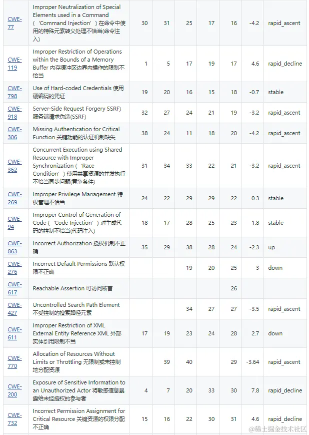 - 需要特别关注快速增长的安全问题:CWE-918:服务端请求伪造(SSRF)、CWE-362:使用共享资源的并发执行不恰当同步问题(竞争条件);