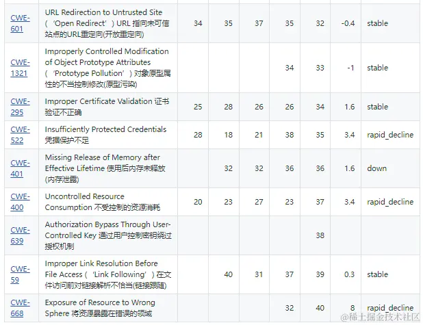 这些CWE的排名在过去的5年中,基本上增长超过了10名。这些CWE有: