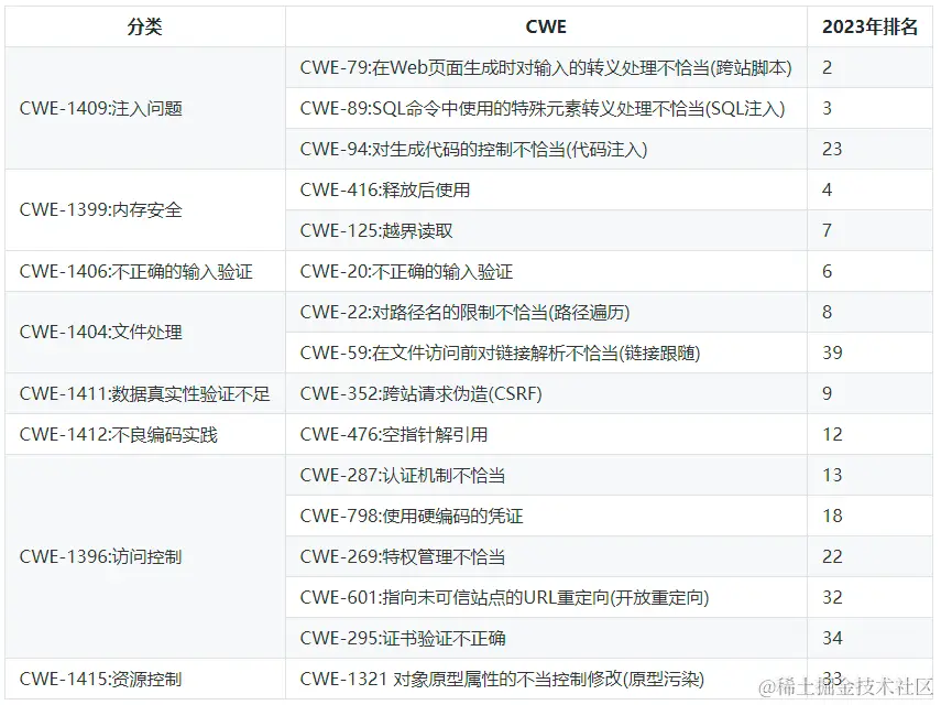 - CWE-400:不受控制的资源消耗。从2019年的20名,降到2023年的37名,下降17名。属于CWE-1416:资源生命周期管理问题。