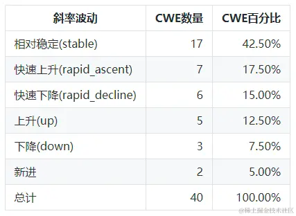 和相对稳定的图相比,增加了5个CWE,这些变动主要是因为缺陷上升或下降的原因,变动的CWE 主要有: