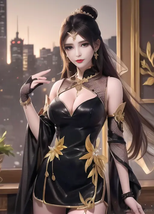 1girl, mature female,black long dress, cityscape, looking at viewer, detached sleeves, hair ornament, elbow gloves, ponytail, gold trim, china dress, forehead jewel, bra,veil,see-through,