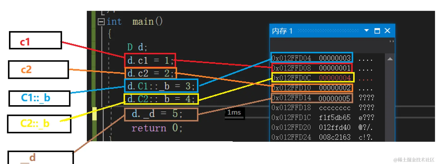这非常出乎我们的意料,按照我们通常的理解,赋值就是将一个变量的值交给另外一个变量,不会出现不相等的情况,究竟是什么导致了 pc 和 pd 不相等呢?我们将在《将派生类指针赋值给基类指针时到底发生了什么?》一节中解开谜底。