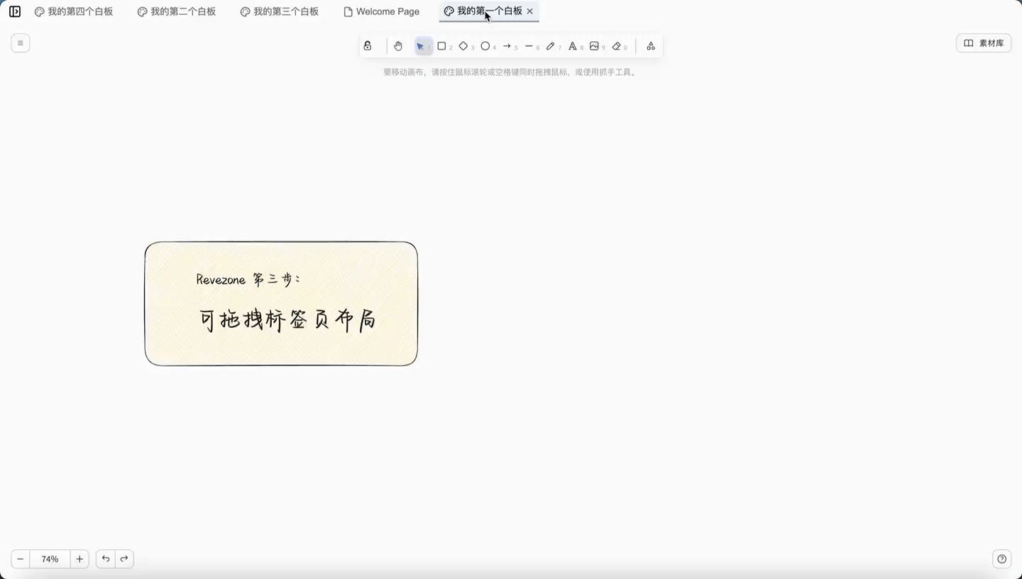 当要管理的白板文件很多时,在不同白板间切换是一件成本很高的事情。Revezone 通过可拖拽标签页的能力允许用户在已打开的文件间进行标签切换,并且允许随意拖拽调整位置和布局,可以进行灵活的分屏管理,方便多个白板同时编辑。