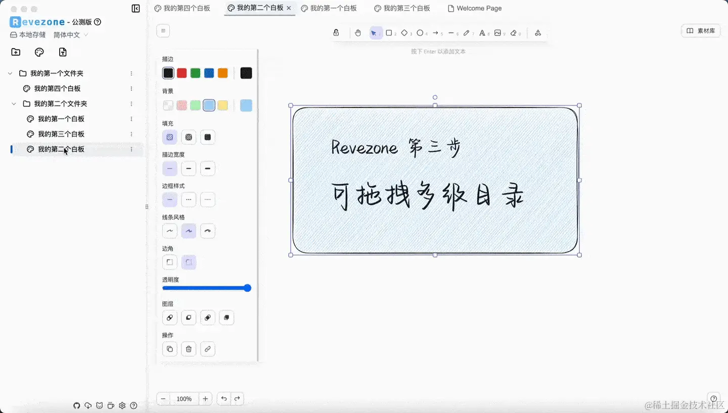 随着白板文件的增多,灵活的目录管理可以极大的提升思维管理的效率。因此,Revezone 支持了可拖拽多级目录管理、多标签页灵活布局、可拖拽侧边栏。