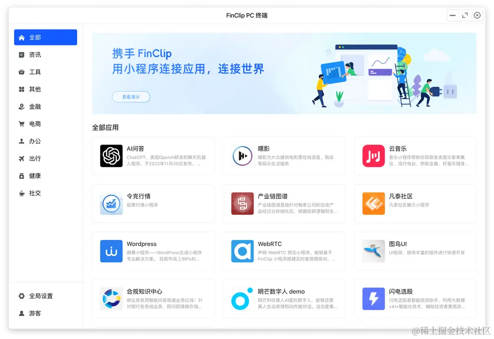 之所以在平台桌面应用文章中介绍,就是除了FinClip移动端跨端开发的能力,它还支持在手机以外,如Windows、Mac、Linux、统信、麒麟等平台下运行小程序,这意味着,移动端、PC 端、IOT等智能终端都能运行小程序了。同时,它还提供一个完善的后台管理系统,统一管理小程序的上架和下架、监测小程序的使用详情,换句话说,借助该工具,可以借助微信小程序生态的成熟度,快速引入业务生态来壮大、丰富自己的业务场景,实现技术和业务双降本增效。