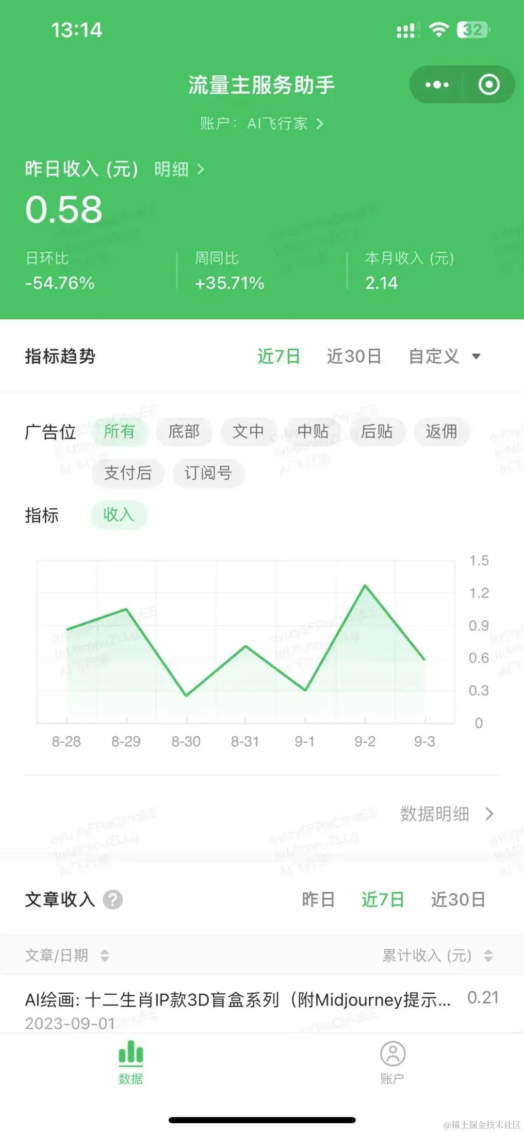 流量主的收益来源是广告的展现,只要有人浏览你的文章,就能获取收益。 我的收益也在不断的增加,坚持日更下去,相信会更好。