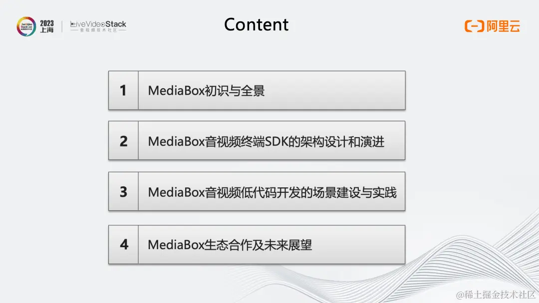 接下来我将从MediaBox初识与全景、音视频终端SDK的架构设计和演进、音视频低代码开发的场景建设与实践和生态合作及未来展望四个方面进行分享。