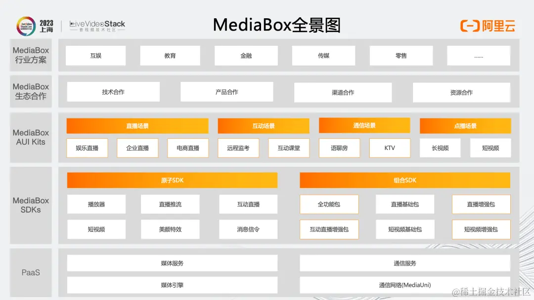 通过MediaBox全景图,可以看到,MediaBox由音视频终端SDK、音视频低代码AUI Kits两大部分组成,并基于行业生态合作构建音视频场景方案。