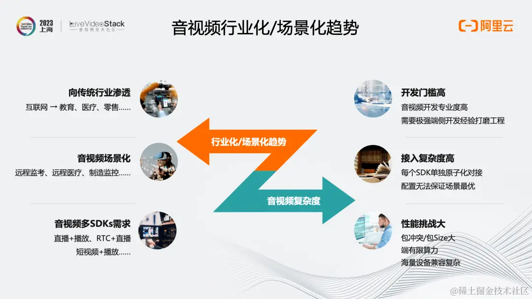 从研发侧来看,音视频的复杂度使得行业客户也面临许多挑战,例如开发门槛高、接入复杂度高、性能挑战大等等。