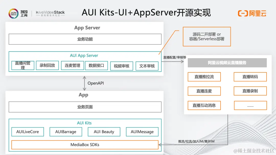 场景化方案一般由App、AUI Kits以及App Server配合云服务来完成。为了方便客户一站式集成,App Server当前已经对接了常用的直播审核、录制等阿里云PaaS层功能,客户可以基于源码进行二次开发部署,或者直接使用容器化的方式完成服务部署。客户端的组件会与服务端进行交互,完成场景化的业务功能。