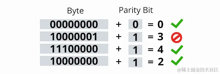 - 奇偶校验位: 奇偶校验是一种简单的错误检测方法,它通过在数据字节末尾添加一个额外的位(奇校验位或偶校验位)来检测错误。根据校验位的设置,数据字节的总位数可以是奇数或偶数。例如,如果校验位设置为使数据字节的总位数为奇数,那么校验位将被设置为确保总位数为奇数。如果在数据传输过程中发生了错误,奇偶校验位将不匹配,从而指示出现错误。