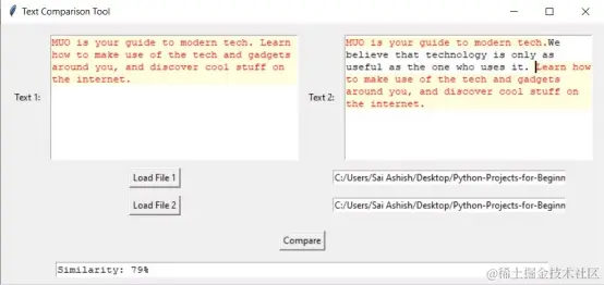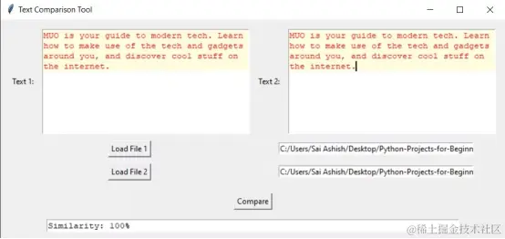 当您运行这个程序时,它会显示一个窗口。点击Load File 1按钮后,将打开文件对话框,要求您选择一个文件。选择一个文件后,程序在第一个文本框内显示内容。在输入路径并点击Load File 2后,程序将在第二个文本框内显示内容。在点击Compare按钮后,您得到的相似度为100%,它高亮显示相似度100%的整个文本。
