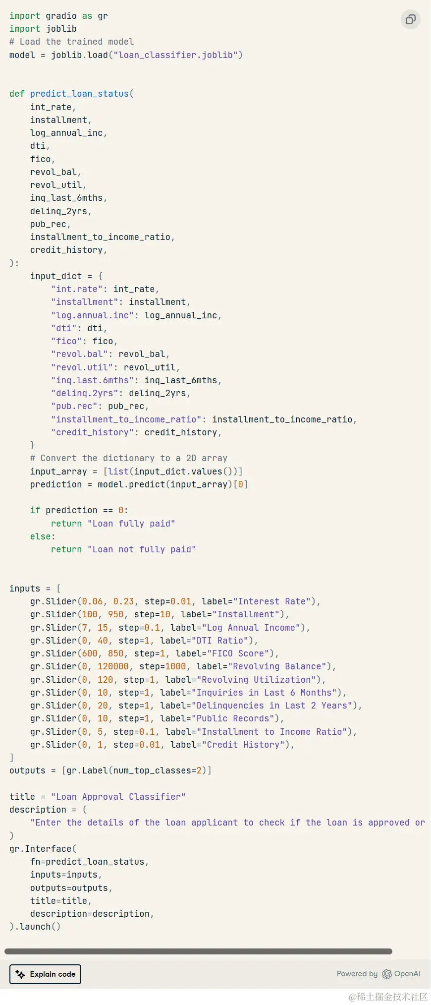 ChatGPT 已经知道上下文,所以我们需要让它为贷款数据分类器编写一个 Gradio Web 应用程序。