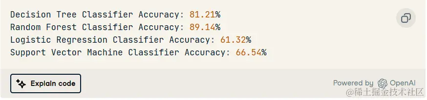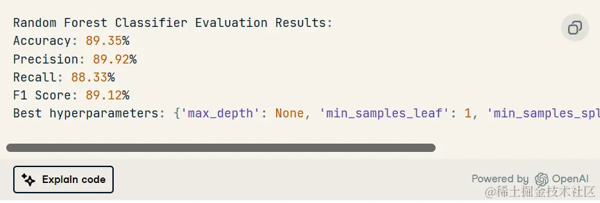 之后,ChatGPT 自动添加代码,在测试集上选择最佳模型进行模型评估,并显示性能最佳的超参数。