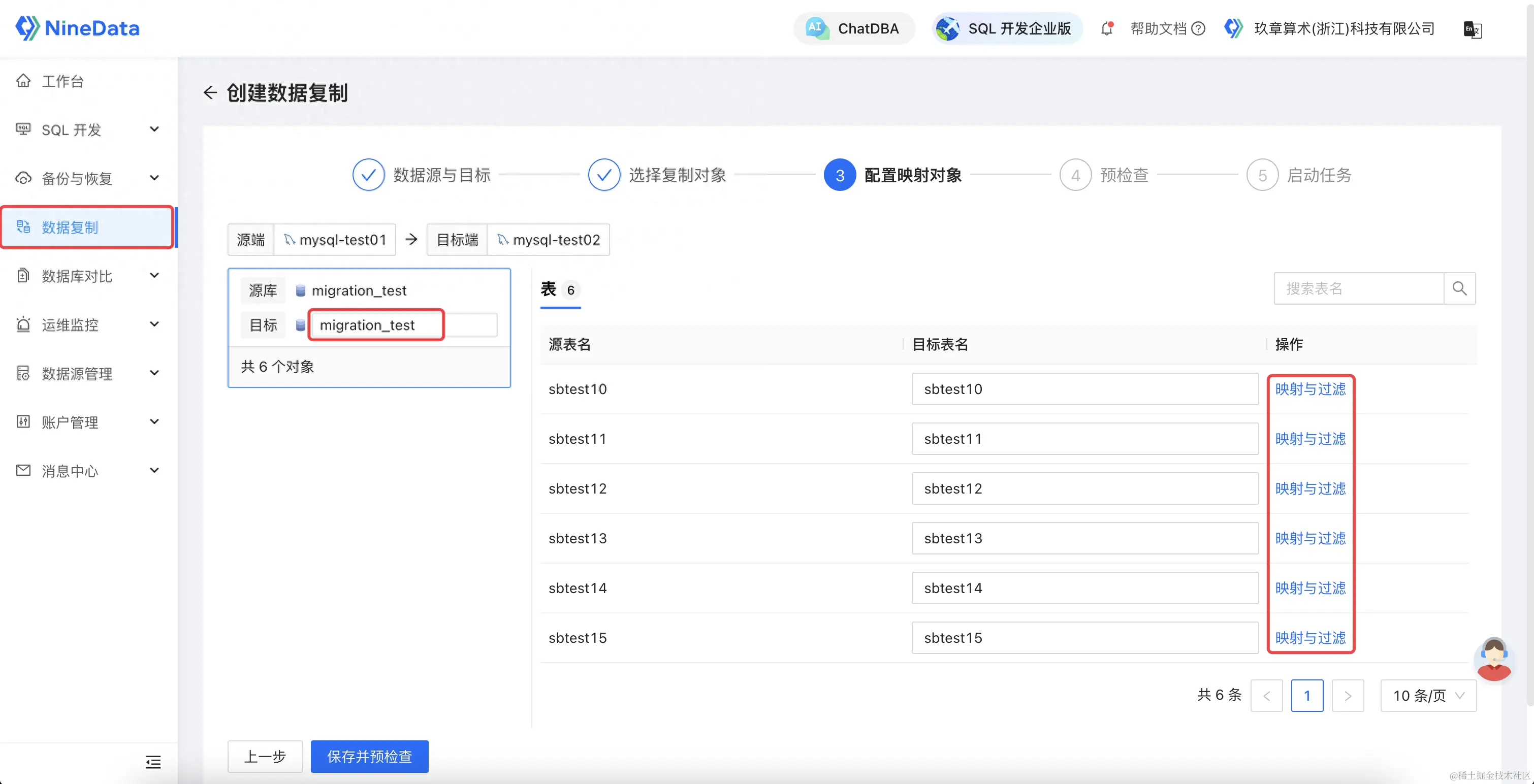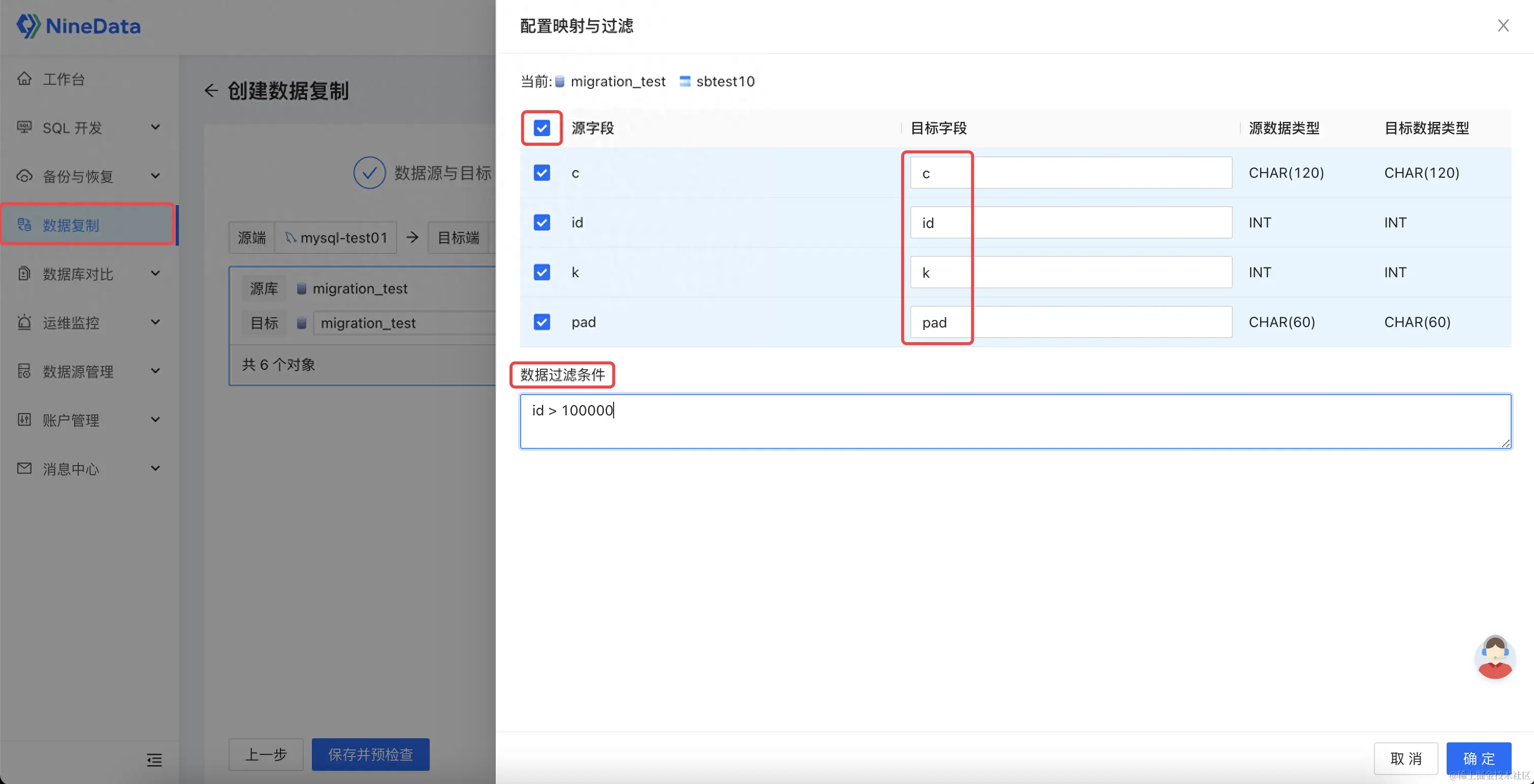 配置映射和过滤规则:可自定义迁移的库名、表名和按照不同的过滤条件进行多表的部分数据迁移,也可以针对表的列名进行映射和部分列迁移。