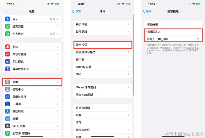 依次打开手机的【设置】—【通用】—【隔空投送】,将其设置为【仅限联系人】或者【所有人】,只有这样才能接收别人投送的信息。