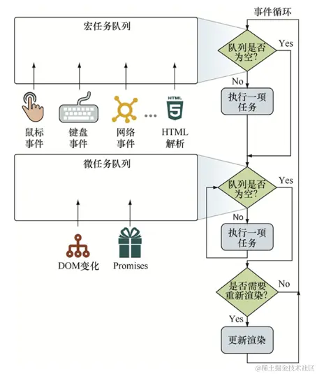 事件循环不仅仅包含事件队列,而是具有至少两个队列,除了事件,还要保持浏览器执行的其他操作,这些操作被称为任务,分为两类:宏任务和微任务。