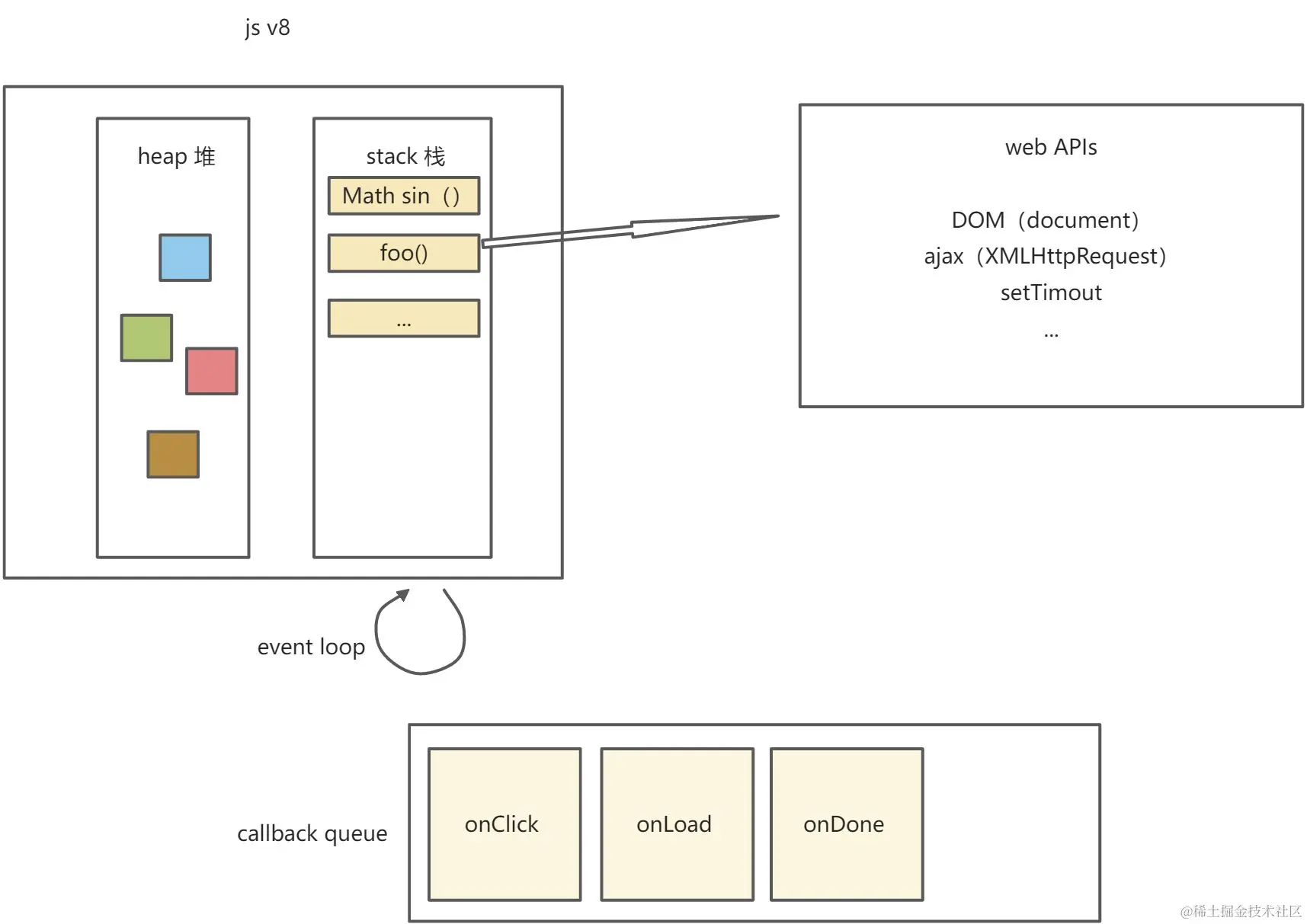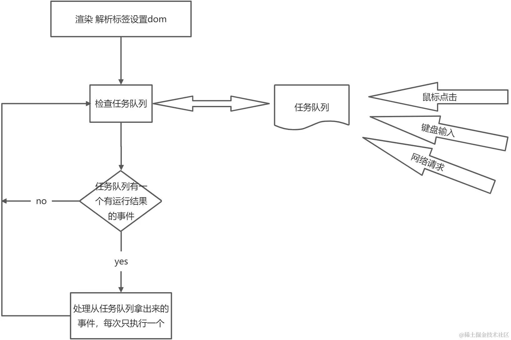 主线程运行时,产生堆栈,栈中代码调用各种外部api,在任务队列加入各种事件,栈中同步代码执行完毕,主线程去读取任务队列,依次执行那些事件对应的回调函数。