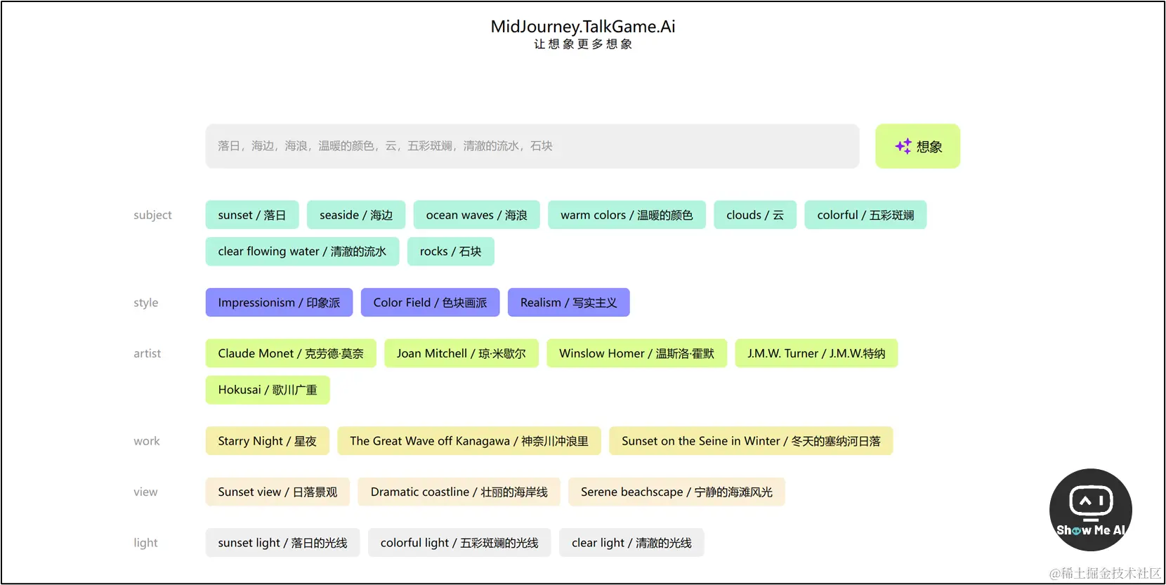 网站页面非常简洁,在输入框内描述想要创作画面的关键词,点击「想象」按钮,等待几秒钟就可以看到网站生成了中英双语的多个提示词,分为主题、风格、艺术家、作品、视角、光源等。