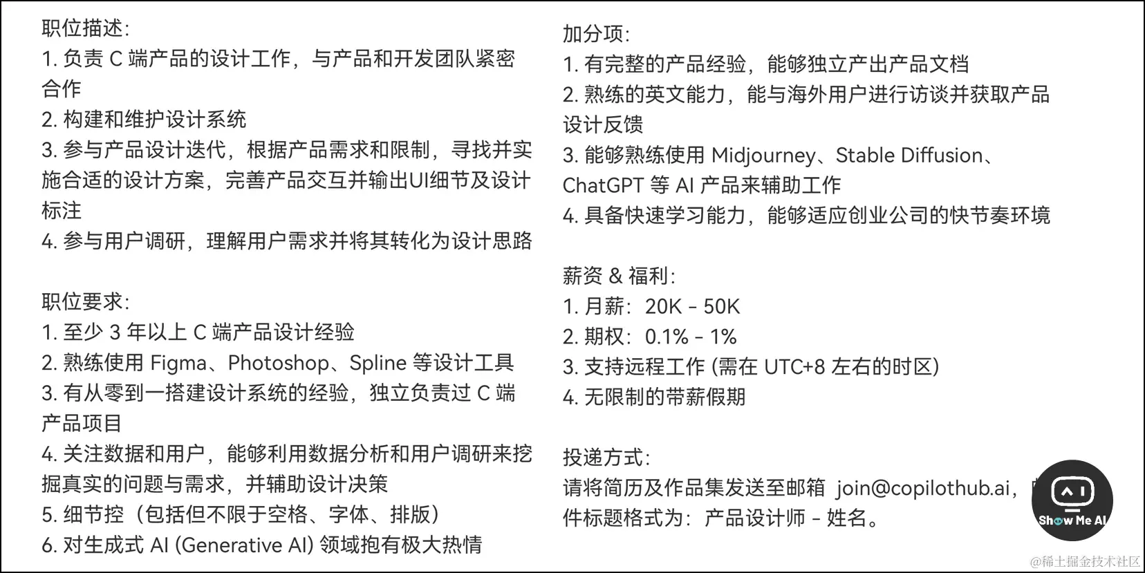 CopilotHub 创始人 @加元.Jiayuan 在个人社交媒体上发布了「产品设计师 (Product Designer)」岗位的招聘信息,并且给出了详细的职位描述和任职要求,而且福利待遇很不错~ ⋙ 即刻 @加元.Jiayuan
